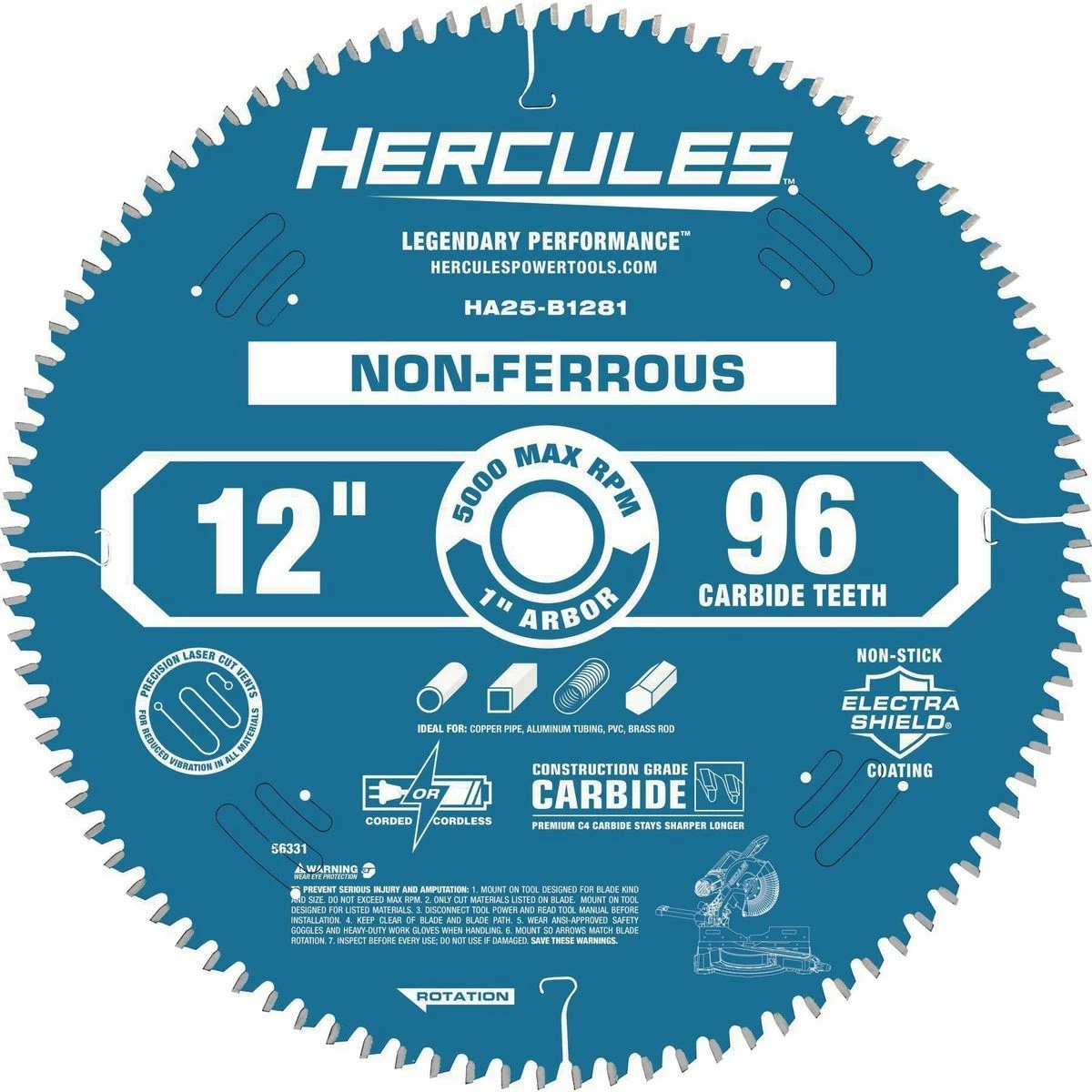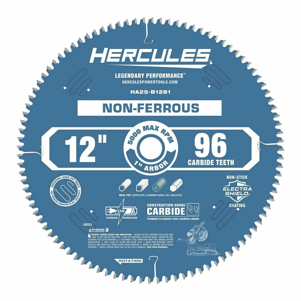The HERCULESโข 12 in., 96T Laminate/Plastics/Non-Ferrous Metal Cutting Miter Saw Blade is specially engineered for cutting copper pipe, aluminum tubing, brass rod, and PVC. Precision laser-cut vents reduce vibration for smoother, more accurate cutting. The non-stick ELECTRA-SHIELDยฎ coating prevents sticking, gumming or burning.