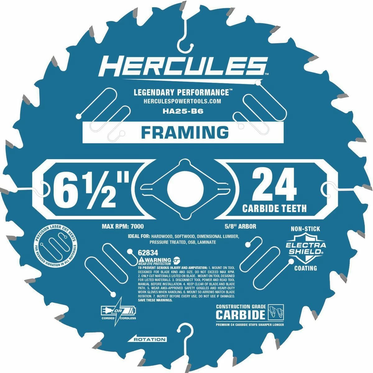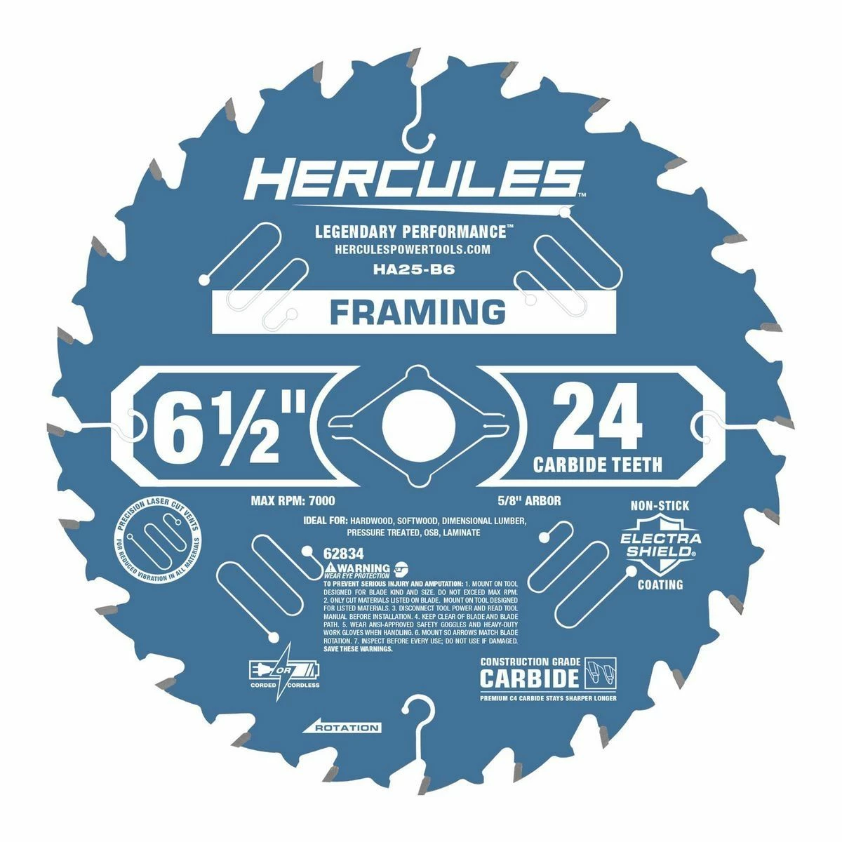The HERCULES™ 6-1/2 in., 24T Framing Saw Blade makes fast, clean cuts in hardwood, softwood, dimensional lumber, pressure treated lumber, OSB, and laminate. Razor-sharp premium tungsten carbide cutting edges can be resharpened for exceptionally long blade life. The Electra Shield™ non-stick coating prevents gumming and burning. Laser-cut expansion vents and vibration channels keep the blade straight and true.