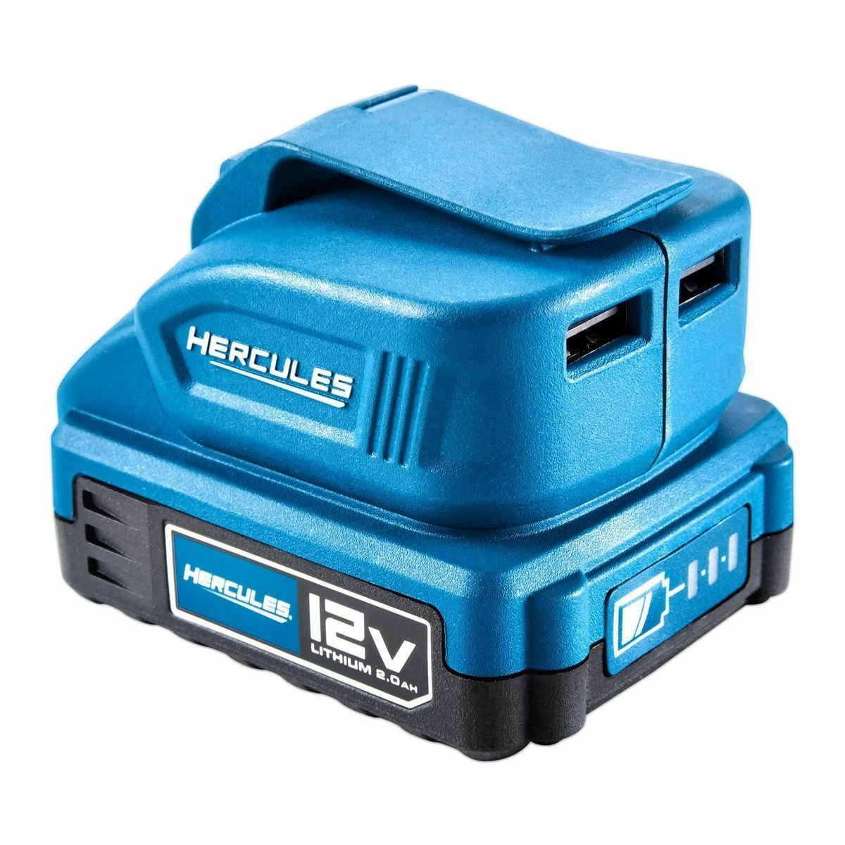 When AC power is not available simply use the HERCULESโข 12V Lithium-Ion USB Power Source Adapter to charge two devices at the same time. Ideal for charging mobile phones, tablets, cameras and small electronic devices. Includes molded belt clip and lanyard for easy storage on tool bags or tool belts. Impact resistant design built to withstand jobsite abuse