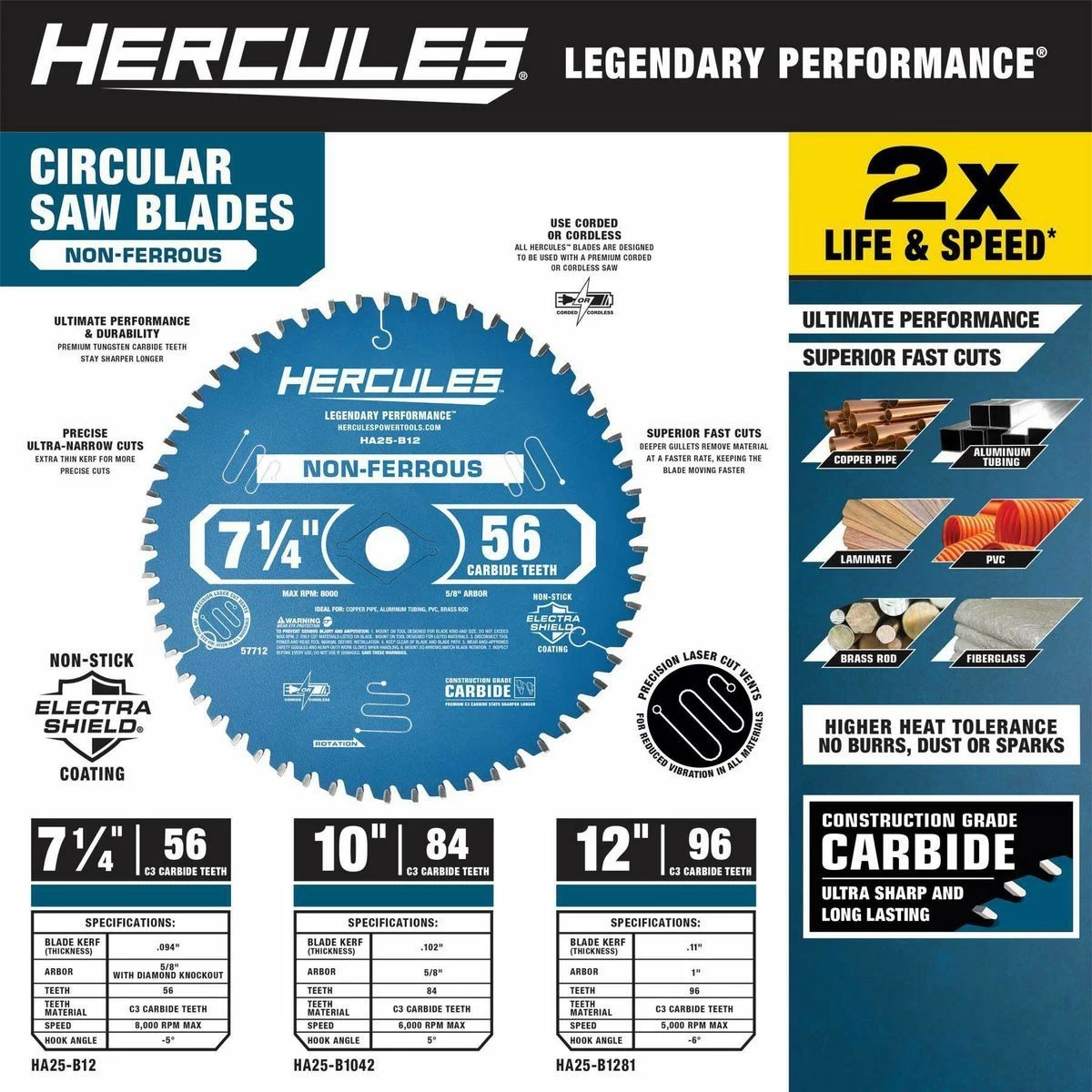 This HERCULESโข 7-1/4 in., 56T Non-Ferrous Circular Blade is specially engineered for cutting copper, aluminum, brass, fiberglass, PVC, and laminate. Precision laser-cut vents reduce vibration for smoother, more accurate cutting. The non-stick Electra-Shieldยฎ coating prevents sticking, gumming and burning.