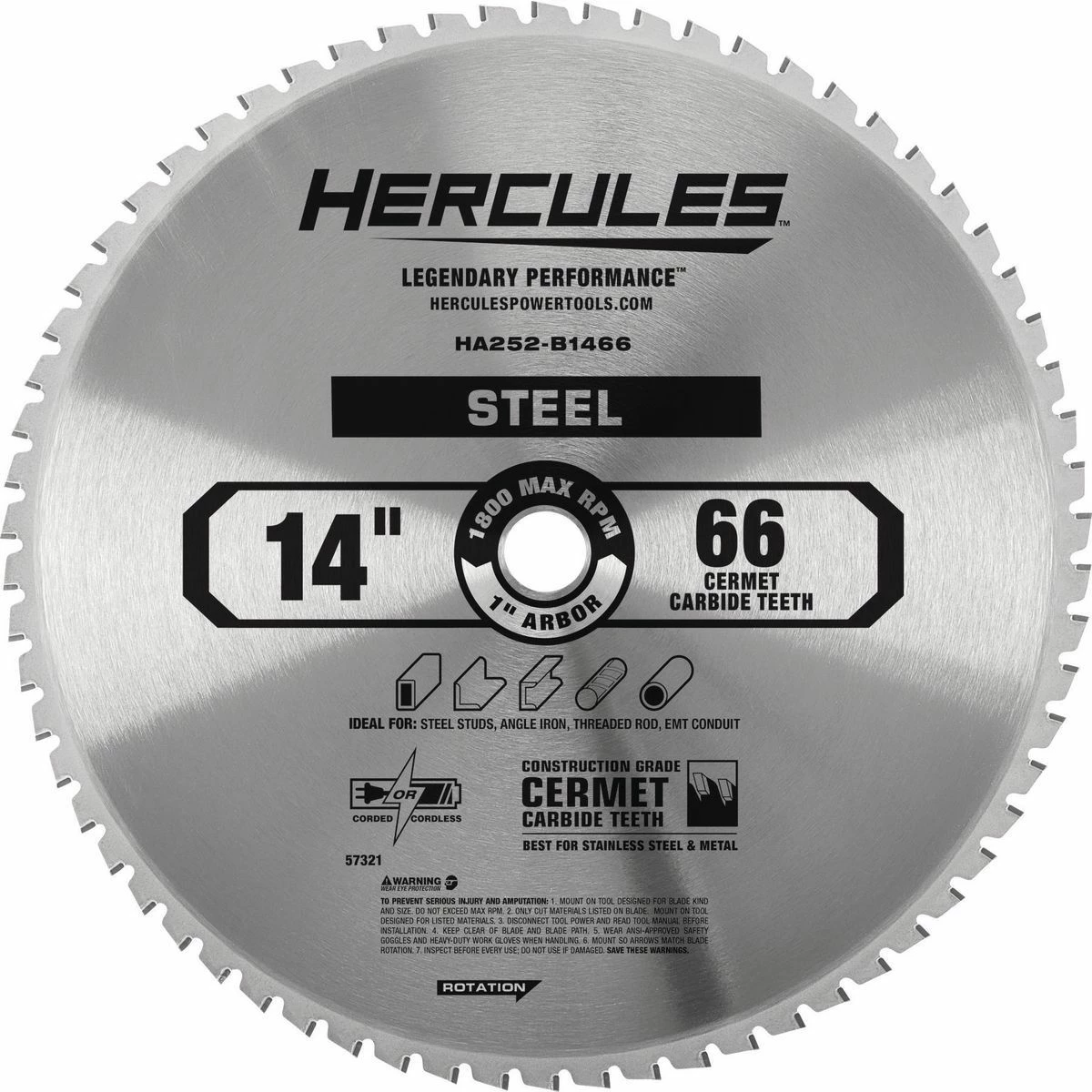 This HERCULESโข 14 in., 66T Cermet Carbide Circular Saw Blade is specially engineered for cutting steel studs, angle iron, threaded rod, EMT conduit. Construction grade cermet carbide teeth deliver the best performance for cutting stainless steel and metal.